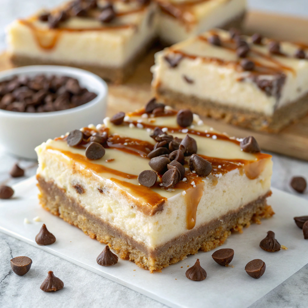 Philadelphia chocolate chip cookie cheesecake bars are a variation of the classic dessert that uses Philadelphia brand cream cheese for a smoother, richer cheesecake layer. The cream cheese’s quality and texture help achieve that dense, bakery-style cheesecake consistency that sets beautifully on top of the cookie crust. For best results, use full-fat Philadelphia cream cheese at room temperature when blending your filling.