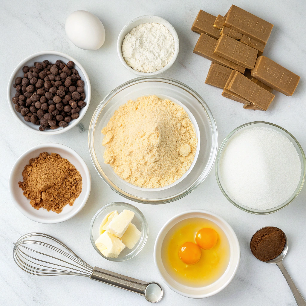 Let’s start our confectionery journey by ensuring we have all the key components on hand. Here’s what you’ll need to create these irresistible cheesecake caramel toffee chocolate chip cookie bars: