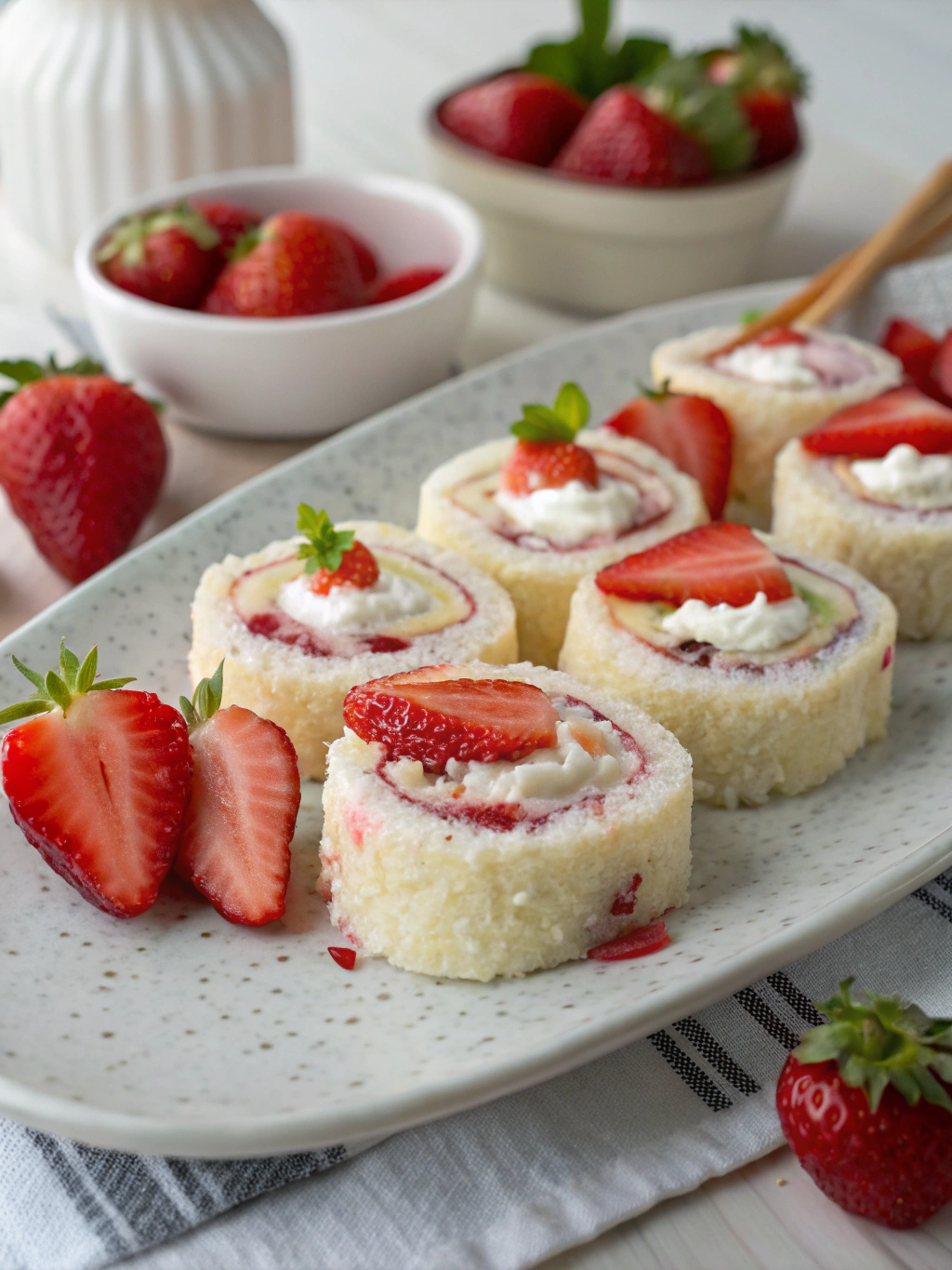 The soft cake layer mimics rice in traditional sushi. Creamy cheesecake becomes the filling, and fresh strawberries take center stage for brightness. Some versions even include whipped cream or graham cracker dust for added texture.